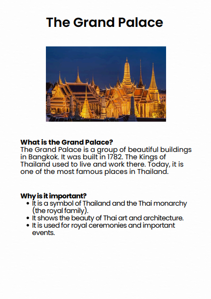 I worked on developing English learning materials for Thai students at CUFAA. As part of the team, I helped design and compile a 121-page English learning booklet focused on building basic communication skills. The booklet covered simple sentence structures, polite expressions, useful musical vocabulary, and descriptive language, including sections about common landmarks in Bangkok to make learning. This project strengthened my skills in content planning, educational design, and creating clear, student-friendly materials for an international audience.